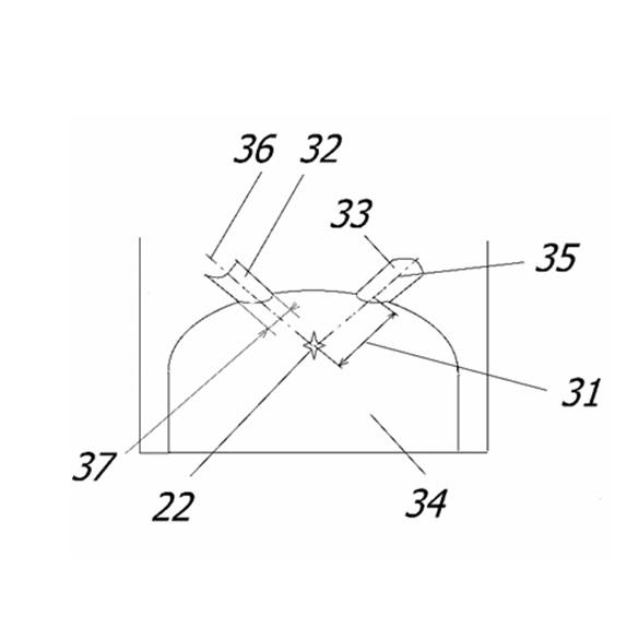 Соединение выходов вихревых каналов с общей расширительной камерой выполнено таким образом, чтобы при работе устройства вихревые потоки воды из вихревых каналов сталкиваются в одной точке22 (см. фиг.5) на расстоянии 31 (расстояние L) от выходного среза каждого вихревого канала.