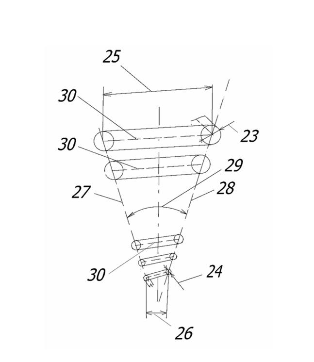 Нейтральная линия каждого вихревого канала выполнена в виде змеевика конусообразной формы. Касательные к нейтральным линиям обозначены позициями 27 и 28. Угол между касательными, расположенными в одной плоскости, обозначен позицией 29.