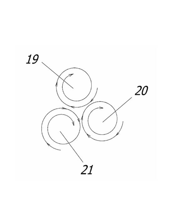 На фиг.6 показаны три вихревых потока 19, 20 и 21, вышедшие из вихревых каналов в общую расширительную камеру. Все три вихря в местах соприкосновения имеют противоположное направление движения воды. В точке 22 (см. фиг. Фиг.5) они соединяются и максимально тормозятся.