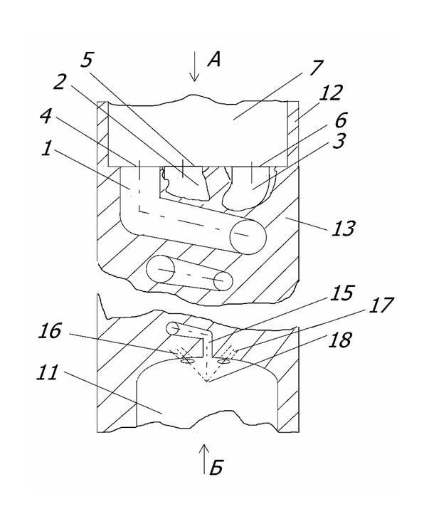 Также вихревые каналы содержат выходы 8, 9 и 10в общую расширительную камеру 11. Общая расширительная камера содержит стенку 14. Конечные участки вихревых каналов обозначены позициями 15, 16 и 17.